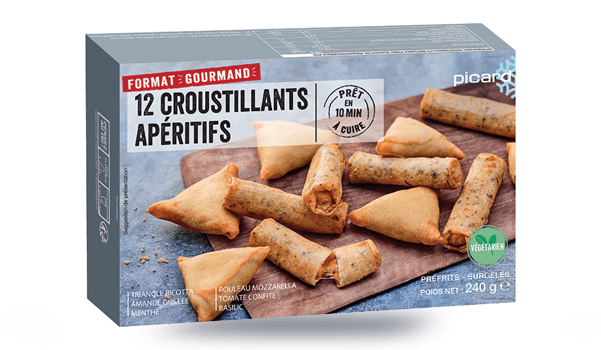Assortiment de 12 croustillants apéritifs préfrits, surgelés, à cuire: 6 triangles garnis d'une farce 34,1% à base de ricotta, amande hachée grillée, menthe et fine pâte 15,9% au blé ; 6 rouleaux garnis d'une farce 34,1% à base de mozzarella, tomate confite marinée, basilic et fine pâte 15,9% au blé et basilic.