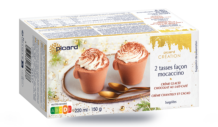 2 desserts glacés composés de crème glacée 84,6% chocolat au lait-café saveur mocaccino, crème chantilly 12,6%, velours chocolat 2,5%, cacao en poudre 0,3%.