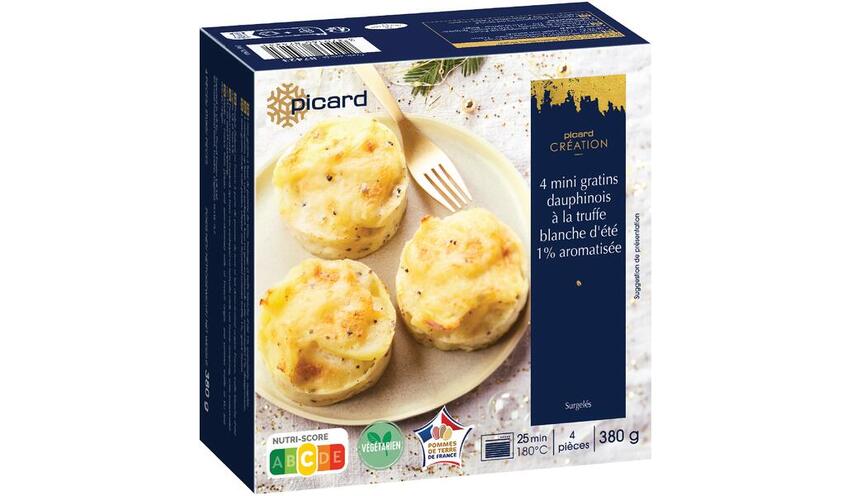 Ces 4 mini gratins dauphinois ont revêtu leur habit de fête avec cette toute nouvelle recette : des pommes de terre origine France, une sauce onctueuse crème-emmental et des brisures de truffe blanche d’été 1% aromatisée pour la touche chic et festive.