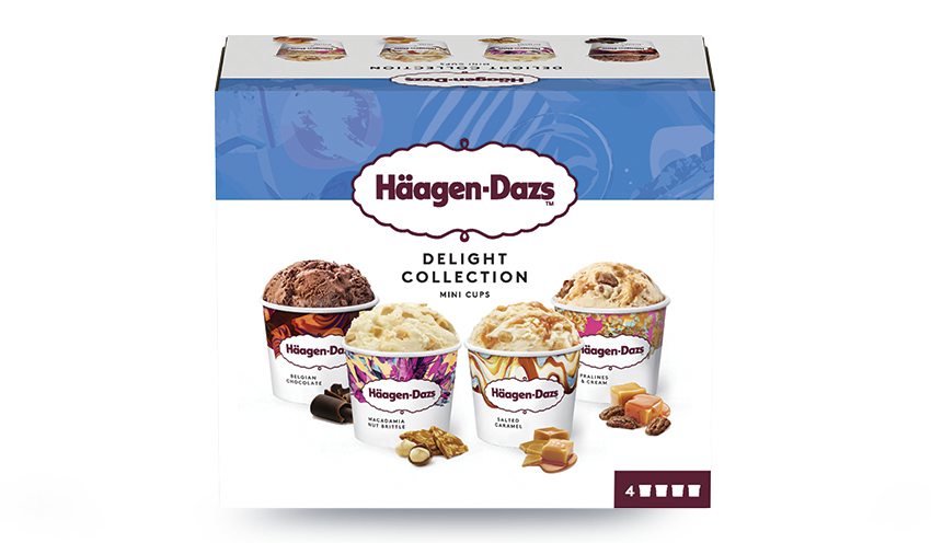 Retrouvez les saveurs incontournables des glaces Häagen-Dazs en version mini ! Belgian Chocolate, Macadamia Nut Brittle, Salted Caramel et Pralines & Cream sont réunis au cœur de cette Delight Collection.