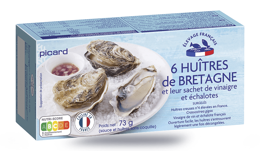 6 huîtres creuses 65,7% et assaisonnement 34,3% au vinaigre de vin et aux échalotes, surgelés