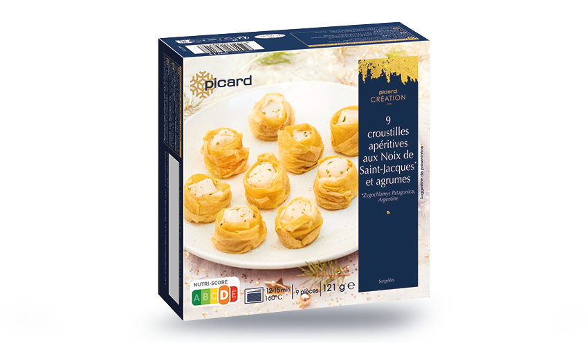 9 bouchées garniture 70,6% aux noix de Saint-Jacques* et aux agrumes, feuille de brick 29,4%, surgelées, à cuire. *Zygochlamys Patagonica, origine Argentine