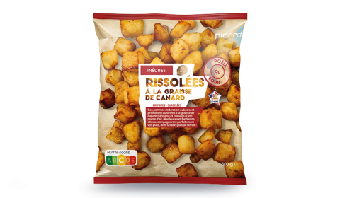 Ecrasé de pommes de terre 31,8% et légumes cuisinés 31,8%, sauté de paleron de bœuf cuit, sauce 18,1% au vin rouge et à l’échalote, surgelés.