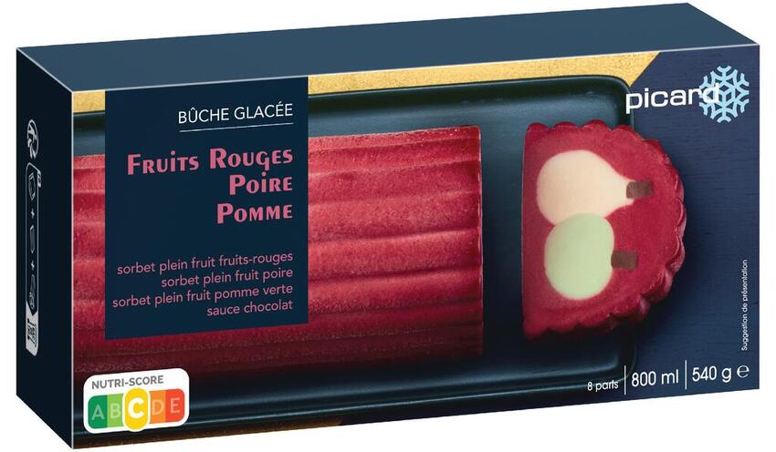 Bûche glacée composée d'un sorbet plein fruit aux fruits rouges 66,6%, d'un sorbet plein fruit à la poire 15,4%, d'un sorbet plein fruit à la pomme verte 15,3% et d'une sauce au chocolat noir 2,7%, surgelée.