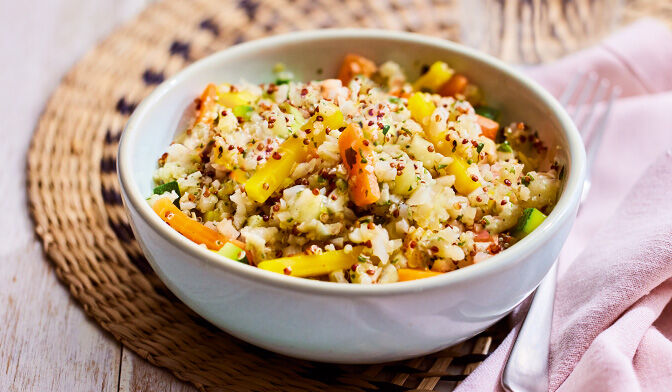 Chou-fleur, petits légumes et quinoa cuit, sauce 10,4% à base de sauce soja, surgelés.