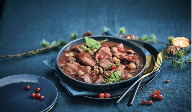Pour vous qui ne voyez pas les fêtes sans gibier, n’attendez-plus pour déguster ce civet de cerf cuisiné au vin de Cahors, façon Grand Veneur, accompagné de groseilles.