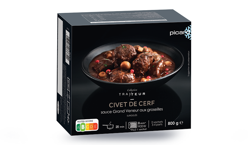 Viande de cerf 45%, sauce Grand Veneur 45%, champignons de Paris cuisinés 7,5%, groseilles 2,5%, surgelés