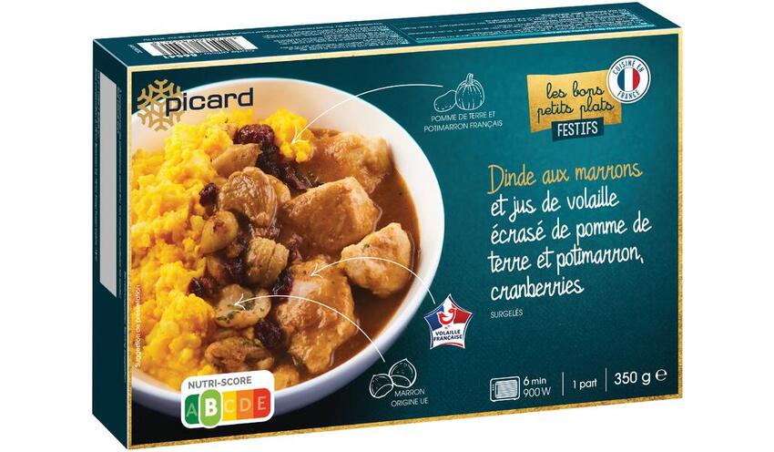 Produit élaboré en France à partir de pomme de terre, potimarron et dinde origine France, marron origine UE (Espagne et/ou Italie et/ou Portugal).
