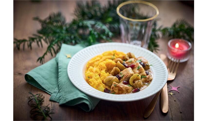 L’incontournable dinde aux marrons se réinvente en version plat individuel pour se faire plaisir en solo même avant le soir du réveillon. Cuisinée avec un délicieux jus de volaille, elle s’accompagne d’un écrasé de pomme de terre et de potimarron, twisté avec des cranberries et éclats de marrons.