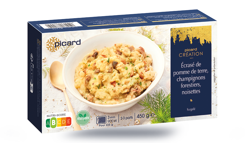 Ecrasé de pommes de terre cuisinées aux champignons forestiers et aux noisettes, surgelé.