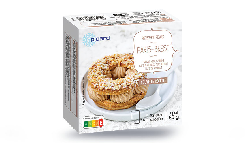 Entremets pâtissier composé d'une crème mousseline 59,4% au praliné, d'une pâte à choux 21,4% pur beurre, d'une pâte de praliné 11,9%, et d'un décor 7,3% à base de noisette – surgelé