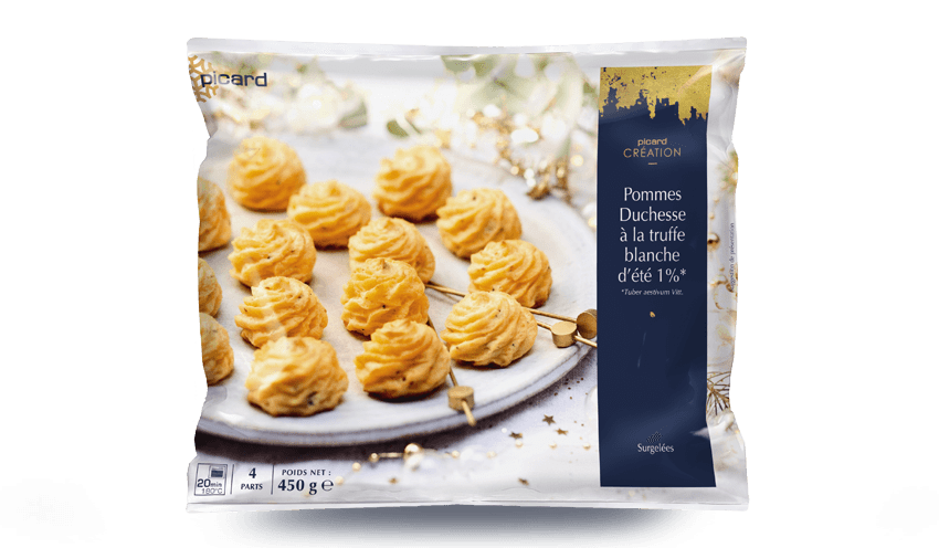 Préparation à base de purée de pomme de terre, de jaune d’œuf, de beurre et de préparation culinaire à base de truffe blanche d’été (Tuber aestivum Vitt) 1% aromatisée, surgelée.