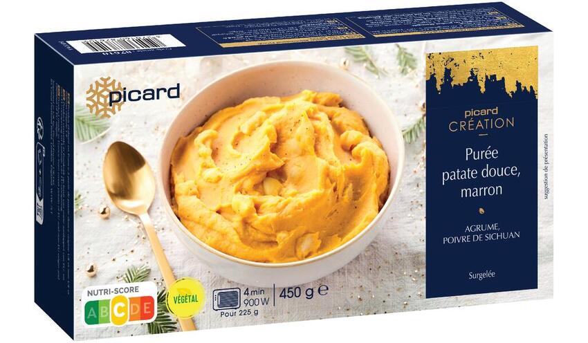 Purée de patate douce et de marron cuisinée au lait de coco, jus d’orange et poivre de Sichuan, surgelée, à cuire.