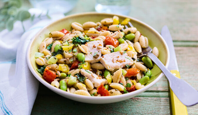 Riche en protéines et source de fibres, cette salade qui mélange gnochettis, légumes et poulet est un repas équilibré à la fois gourmand et sain, le tout avec moins de 3% de matières grasses.